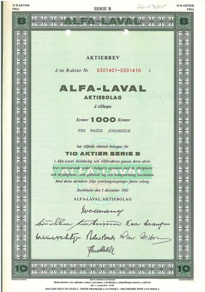 Alfa-Laval AB, 1 000 kr, 1965, Stockholm, makulerad