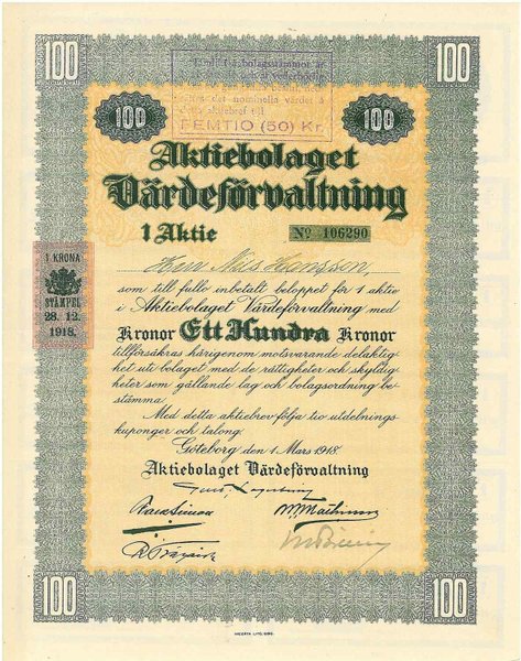 Värdeförvaltning, AB, 100 kr, 1918, Göteborg