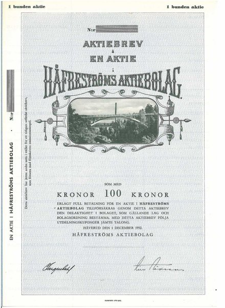 Håfreströms AB, 100 kr, 1952, Håverud, Referens: GA.1838, bild, blankett