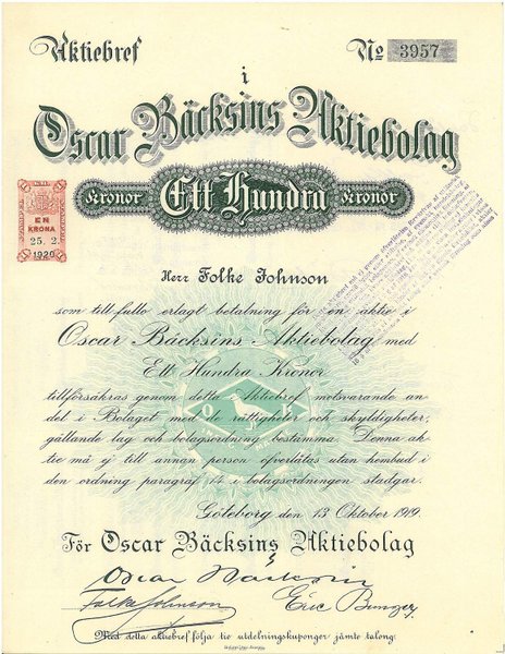 Oscar Bäcksins AB, 100 kronor, 1919, Göteborg, utställd på herr Folke Johnson med kuponger