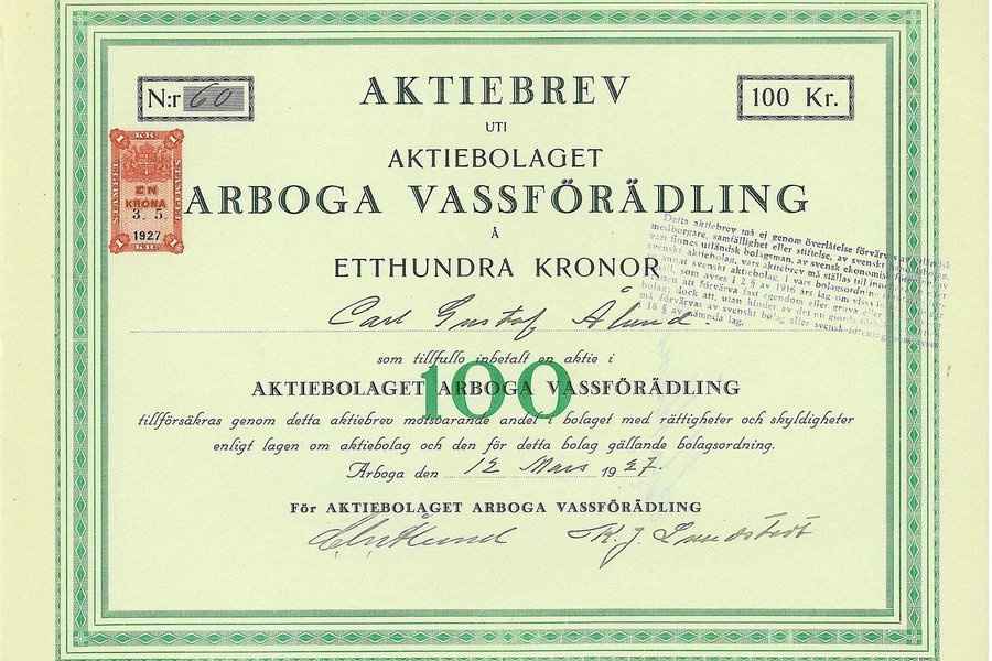 Arboga Vassförädling, AB, 100 kr, 1927, Arboga. Utställd: Carl Gustaf Ålund. Bransch: Lantbruk/Verkstad. RSA: 226. Storlek: 29,3 x 22,8 cm.