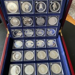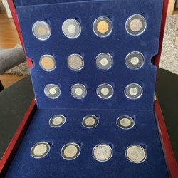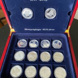 Samlarobjekt från Mynthuset Sverige. Set med nio stycken 2 kr i ett elegant träskrin med blå sammetsinredning. Varje föremål är individuellt inkapslat. Skrinet har ett guldfärgat spänne. Mynten är från 1942-1950. I mycket bra skick.