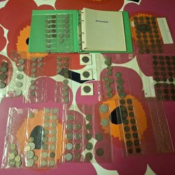 Samling av olika valutor från olika länder. Inkluderar valutor från Sverige (1963, 5 öre), Mexico (1975), Rumänien (1966), Mexico (1969), England (1968) och 5 öre.. allt enligt bild