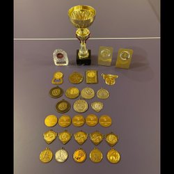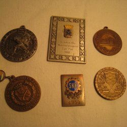 Ett varierande urval av medaljer, inklusive "Lag cm 89", "1:A DIV.3 1973", "VARPA CH. LAG 95", "RULA-LAG 1964", "RULA-LAG 1977" och "IDROTTSFÖRBUND SMÅLANDS".