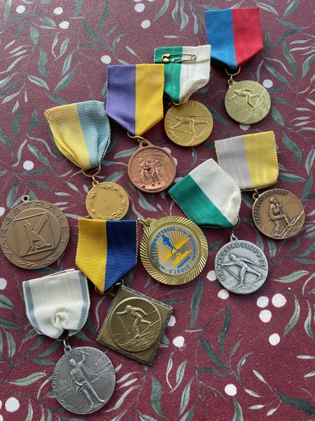 En samling av medaljer från olika evenemang och organisationer, inklusive Vargrännarloppet, Gammelstadloppet, och "Idrottsföreningen Kamraterna". En medalj har texten "Nattssol över Polcirkeln - maraton - 21097,5-me".