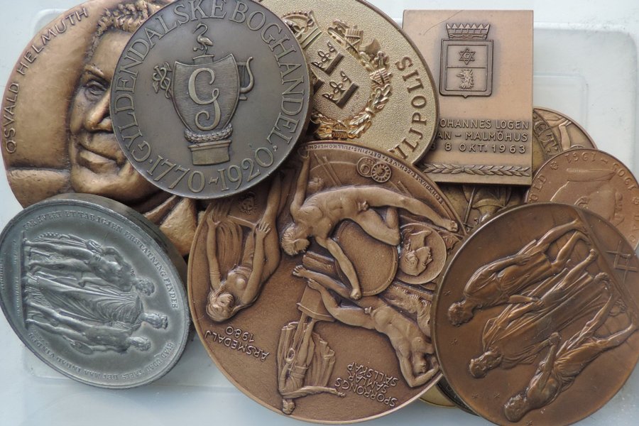 Samling av medaljer. Inkluderar Osvald Helmuth medalj, Gyldendalske Boghandel 1770-1920, Johannes Logen Malmöhus 8 okt 1963, Sportronngs Samlar Sällskap Årsmedalj 1980.