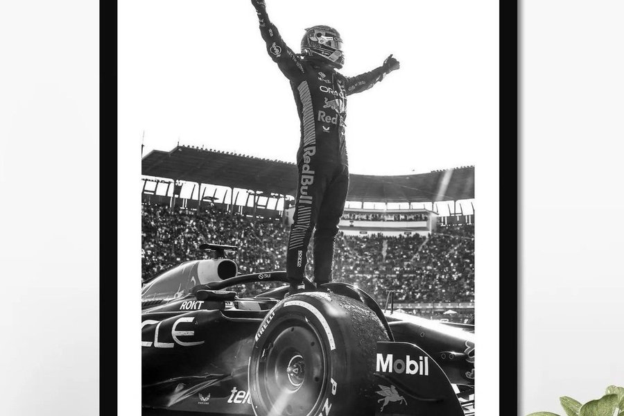 En kraftfull poster föreställande Max Verstappen, en av Formel 1:s mest dominanta förare i modern tid. Bilden visar Verstappen stående ovanpå sin Red Bull Racing-bil efter ett lopp, med armarna i luften inför en jublande publik – ett ikoniskt ögonblick som symboliserar seger, dominans och ren racingglädje.