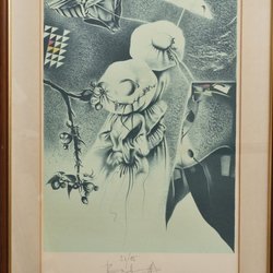 Affisch av Chagall, tryckt 1989. Motivet föreställer människor och djur i en by.