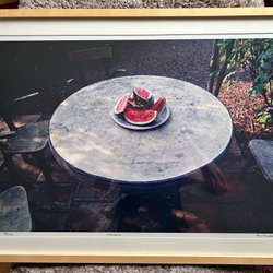 Inramad poster med motiv av bakelser, naivistiskt motiv. Signerad av tygkonstnären Inger Åberg.