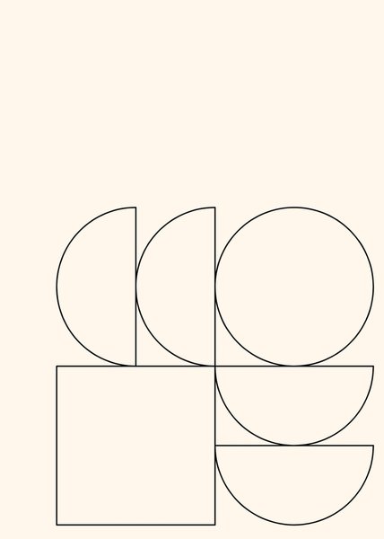 Ett abstrakt konstverk med geometriska former. Konstverket består av cirklar, halvcirklar och en kvadrat i ett minimalistiskt uttryck.