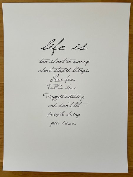 Poster med texten ”Life is too short to worry about stupid things. Have fun. Fall in love. Regret nothing and don't let people bring you down.” Mått: 40x30 cm.