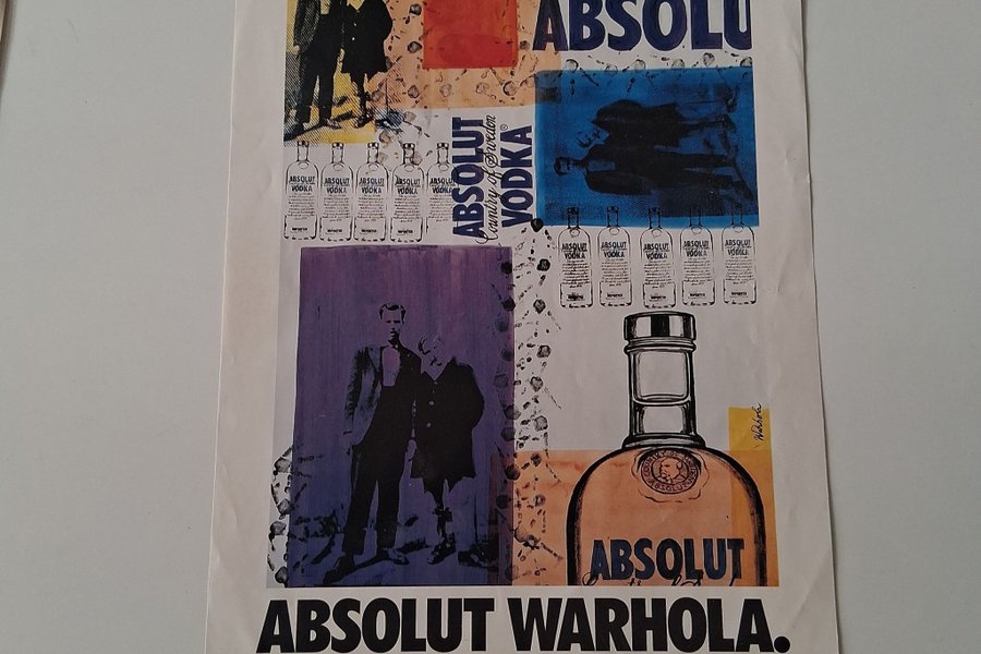 Affisch med Absolut Warhola-motiv. Designen inkluderar flera Absolut Vodka-flaskor och konstnärliga inslag.