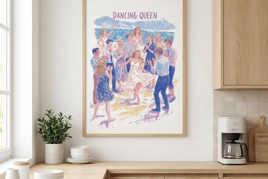 Stilren och färgstark poster inspirerad av den klassiska låten Dancing Queen av ABBA – en av världens mest älskade poplåtar. Perfekt för fans av 70-talspop, disco och svensk musikhistoria. Postern blir en snygg och lekfull detalj i vardagsrum, sovrum, musikrum eller festhörna och är en uppskattad present till ABBA-fans.