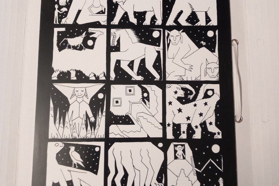 Affisch med motiv av Robert Wibeck. Bilden är svartvit och föreställer nio rutor med olika fantasifulla figurer och djur. Signerad "ROBERT WIBECK" längst ner i mitten. (ca: 21 x 26 cm)