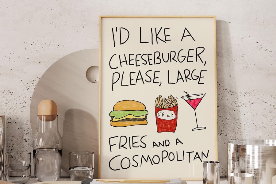 Humoristisk och stilren poster med lekfull text där en klassisk beställning av cheeseburgare, pommes frites och en Cosmopolitan cocktail står i centrum. Kombinationen av handritad typografi och enkla illustrationer skapar ett modernt och charmigt uttryck med både humor och personlighet.