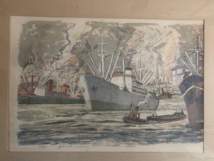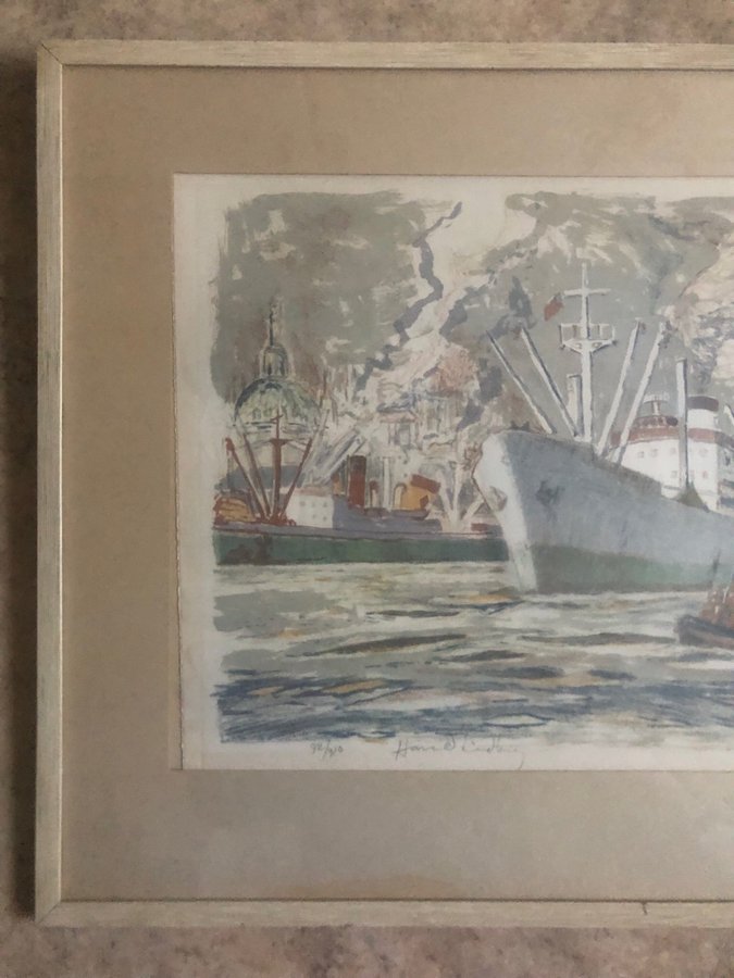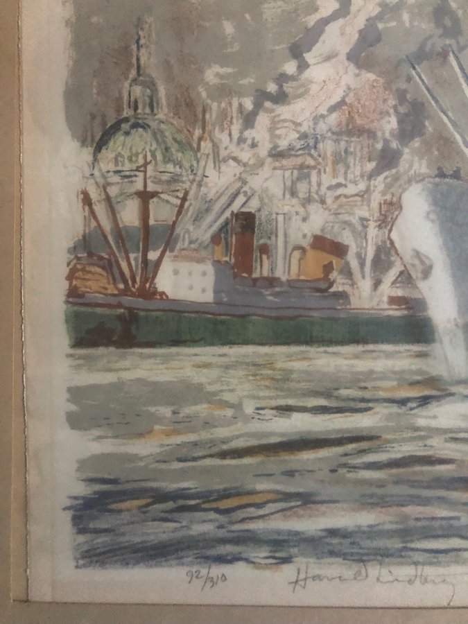 Harald Lindberg ”Stockholms inlopp” signerad färglitografi 92/310 ca:33x50 cm.