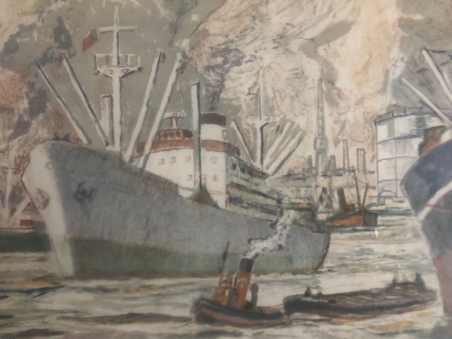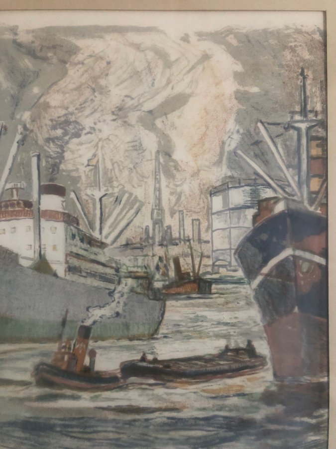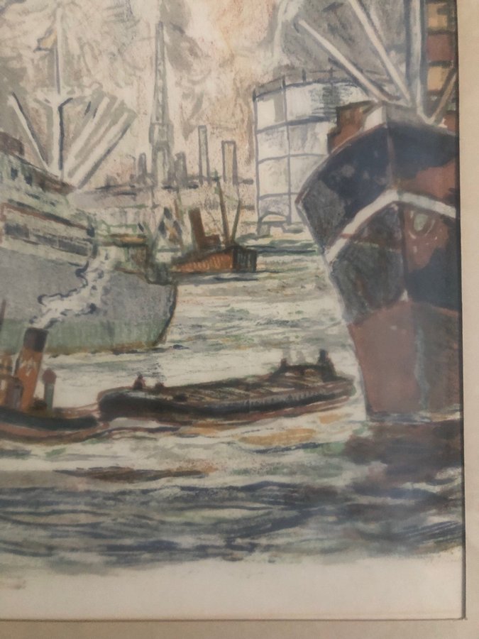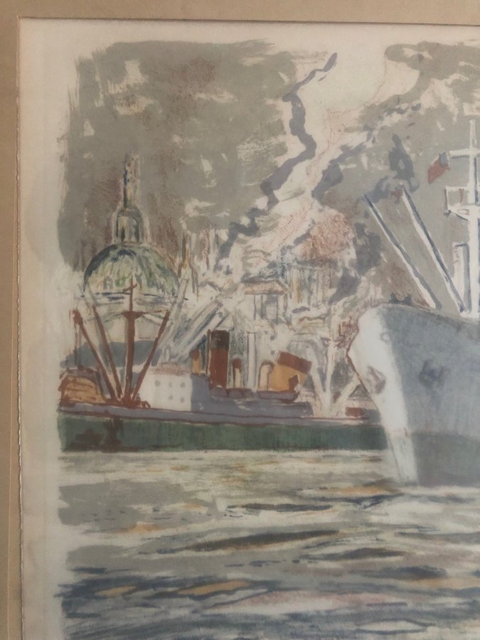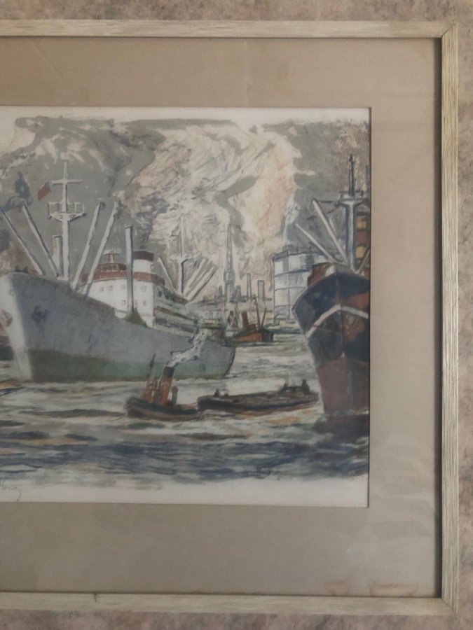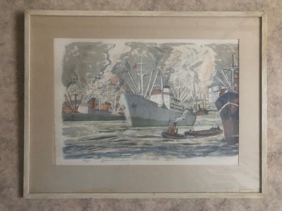 Harald Lindberg (1901-1976) ”Stockholms inlopp” signerad färglitografi 92/310 ca:33x50 cm, inklusive ram ca:51,5x67 cm. Litografin är signerad längst ned till vänster i bild, bild ej examinerad ur ram. Tavlan är något gulnad, några fuktrosor längst ned på paspartoun förekommer. På baksidan förekommer delvis sprickor i tap’e, önskar ni flera bilder så är det bara att ni mailar till mig! Frakten är gratis med Schenker inom Sverige. Ska tavlan skickas utomlands, då tillkommer fraktavgift till självkostnadspris.