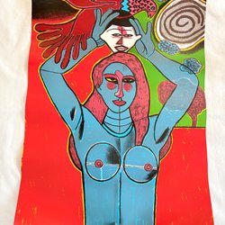 Litografi föreställande en man med käpp som går över ett övergångsställe. I bakgrunden syns en bil och en solnedgång. Bilden är numrerad 1/100 och signerad av konstnären. 47x37 cm relief tryck.