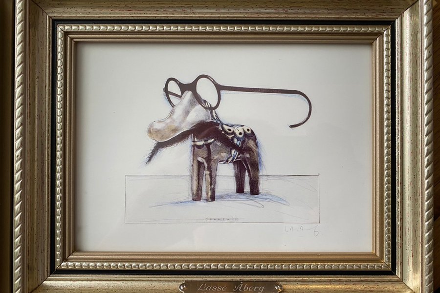 Litografi av Lasse Åberg. Motivet föreställer en åsna med glasögon. Signerad av konstnären.
