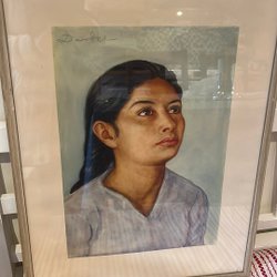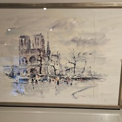 En vacker tavla som föreställer en stadsmiljö med människor och träd. Tavlan har en signatur nere i högra hörnet som jag inte kan tolka. Inramad i en stålram.