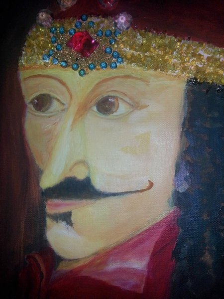 Transilvanien Harskare portret Vlad Tepes kallat Dracula. Akryll på kanvans duk. Krånan desainat med plastdiamanter,och glas. Måt 30/40cm. Konstner Steliana Nuca
