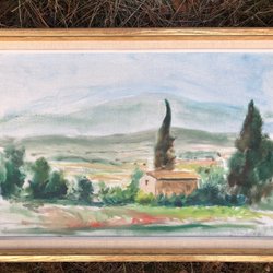 H.C-54.(oidentifierad konstnär) ”Smedjan” signerad akvarellmålning på papper ca:36x47 cm, inklusive ram ca:59x73 cm. Bild ej examinerad ur ram, gulnad paspartou. Målningen är signerad H.F-54 längst ned till höger i bild. Ramen har sedvanligt relaterat slitage (patina). Ber om ursäkt för reflexer i glaset, önskar ni flera bilder så är det bara att ni mailar till mig!