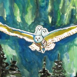 Akvarellmålning med motiv av en vit fågel i ett färgstarkt landskap. Konstverk.
