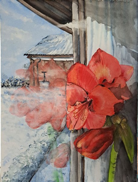 En original akvarellmålning som föreställer en amaryllis i ett fönster med ett vinterlandskap utanför. 23 x 30cm , målad på fint akvarellpapper. Jag är en hobbykonstnär som vill glädja andra med min konst.
