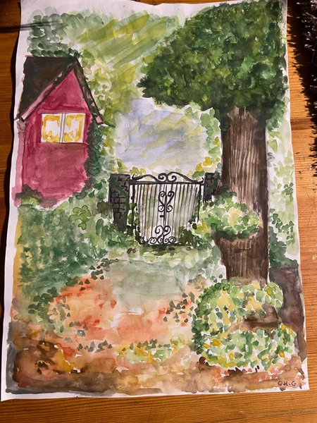 Akvarellmålning föreställande ett rött hus, en grind och ett stort träd i en trädgård. A4 papper! Målad av mig