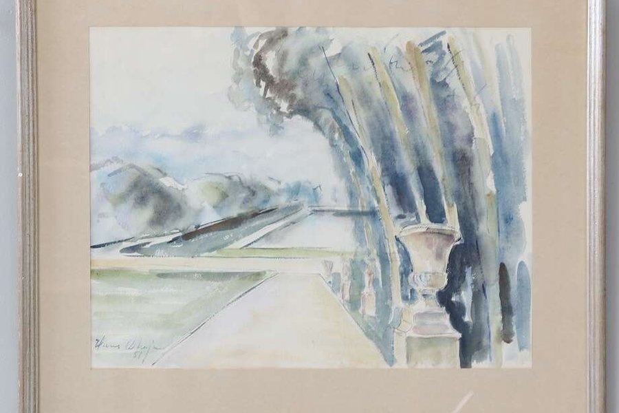 Akvarellmålning med ett landskapsmotiv. Bilden visar en trädgård eller park med träd, en gångväg och en urna. Målningen är utförd i blåa, gröna och gråa toner. Hans Dhejne -51 37 X 48 akvarell