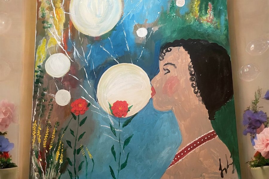 Orginal målning med en kvinna som blåser bubblor. Tavlan har en blandning av färger som blått, grönt, gult och rött. Motivet inkluderar även blommor och cirkulära former. En sprudlande färgstarkt motiv . 40•40