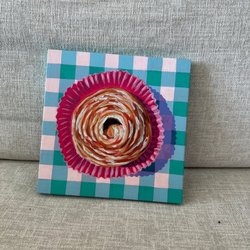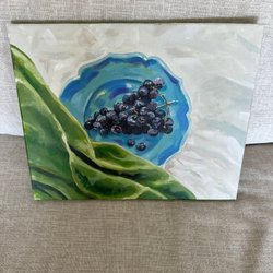 Et maleri med en kvinde i en lys kjole og hat, der står på en sti. Maleriet er indrammet i en guldramme.12cm bred og cirka 17cm lang, Maleri på lærede
