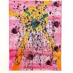 En färgglad målning som föreställer en kvinna med abstrakta former i bakgrunden. Signerad och daterad 2020. Akryl på papp.