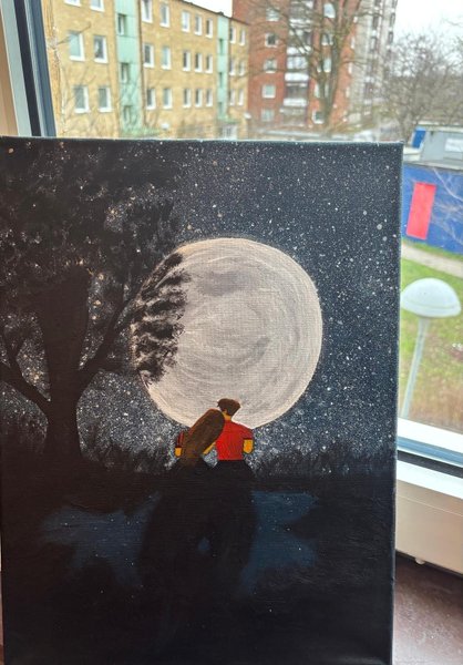En målning som föreställer ett par som sitter under ett träd och tittar på månen.