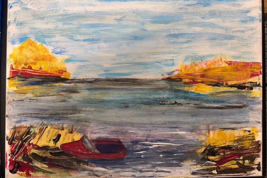 En vacker målning som föreställer ett marint motiv med båtar och landskap. Färgerna skapar en levande och intressant effekt.