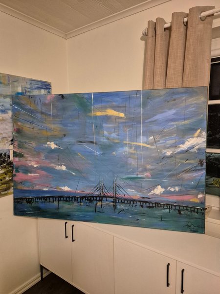 Målning med motiv av en bro över vatten under en himmel med moln. Färgerna inkluderar blått, rosa, gult och vitt. 150x100 (1,5mx1m) stor tavla kvalitets duk. Nymålat. Snarlika stora tavlor sålda från 7500kr och mer..