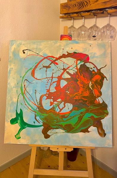 MR art -Abstrakt maleri med flydende malingsteknik. Maleriet har nuancer af blå, grøn, rød og brun.