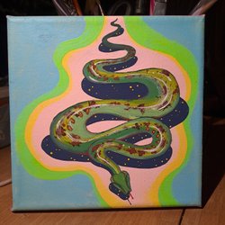 Tavla med motiv av en kvinna som håller en cigarett och en orm som ringlar sig runt hennes kropp. Bakgrunden är orange och gul med moln. Tavlan är oval.