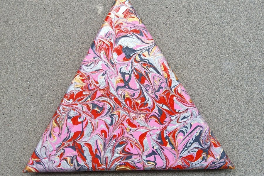En triangelformad målning med ett abstrakt mönster i rosa, rött, silver, guld och grått.
