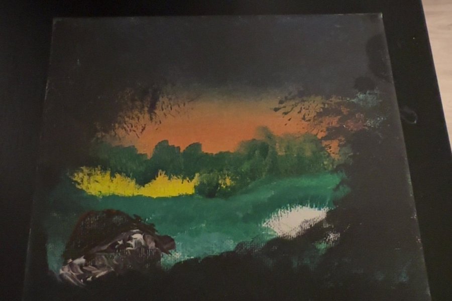 Målning med abstrakt motiv. Färgerna är mörka med inslag av gult, orange och grönt.