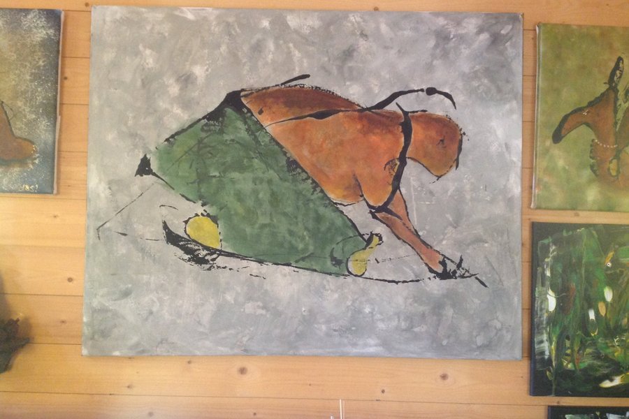 Målning med abstrakt motiv i färgerna grått, brunt, grönt och gult. Konstverket har en matt finish. Namn: Streckhund. 92X73X2cm. Uppspänd duk.