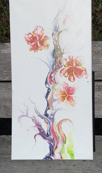 En abstrakt målning med blommotiv. Färgerna inkluderar rosa, orange, lila, blått och grönt. Målningen är gjord med en fluid art teknik.