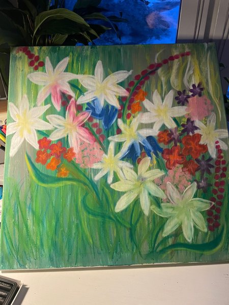 Målning med motiv av blommor i olika färger. Bakgrunden är grön med inslag av gult och blått. Blommorna är vita, rosa, orange, blå och lila.
