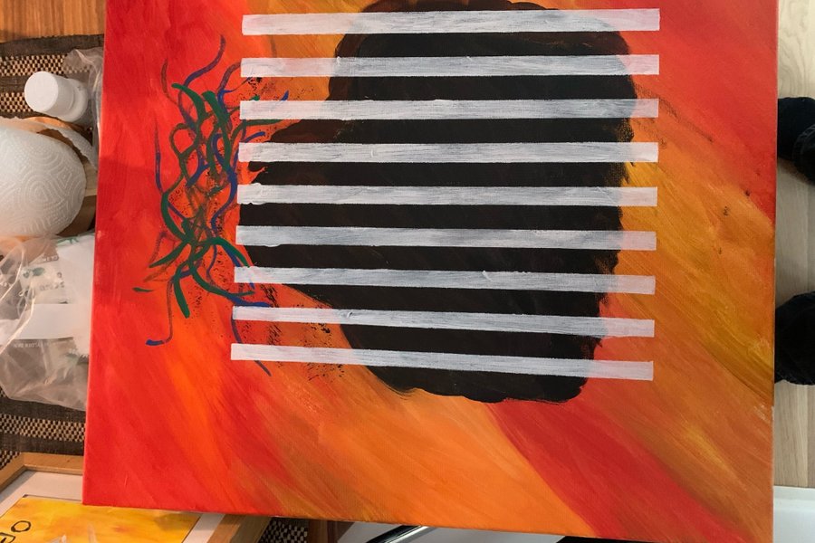 Maleri med farverne rød, orange, sort, hvid, grøn og blå. Maleriet har et abstrakt motiv.