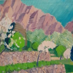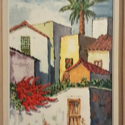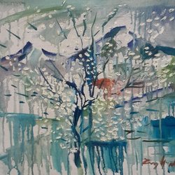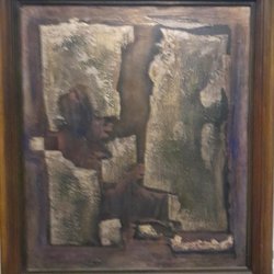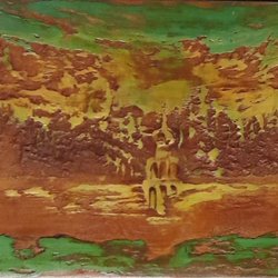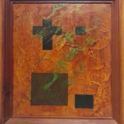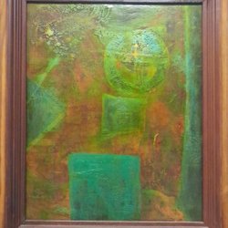 Målning med abstrakt motiv. Föreställer en person med hatt i färgstarka nyanser av blått, gult, orange och grönt.