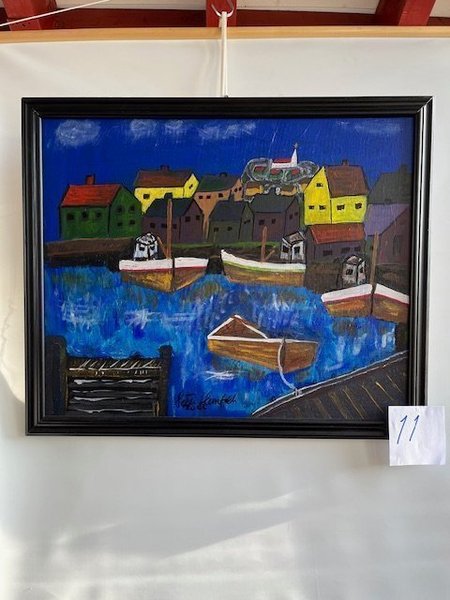 Akryl på linneduk, kilram. En charmig tavla med motiv av en hamnby och båtar. Signerad av konstnären. Höjd 59 cm, Bredd 70cm Peter Glennfalk nr 11