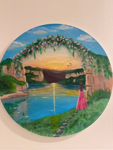 Hand målning med en kvinna i en rosa klänning som står vid en sjö med berg i bakgrunden. En blomsterbåge ramar in solnedgången över vattnet.
