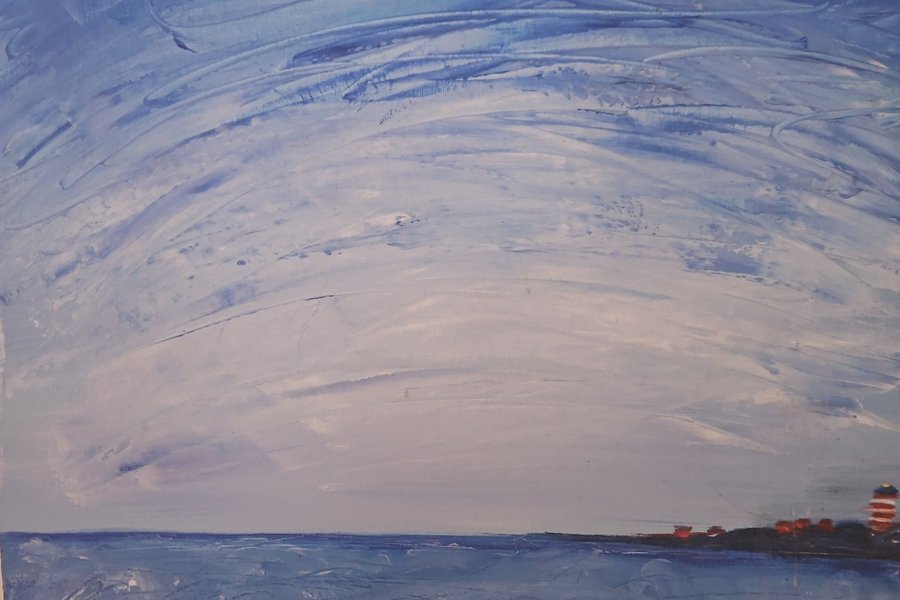 Målning med havsmotiv. Föreställer ett hav med en kustlinje och en fyr i horisonten. Färgerna är i olika nyanser av blått och vitt.