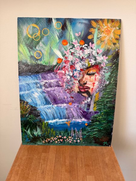 Akrylmålning på duk med motiv av ett ansikte omgivet av blommor, ett vattenfall och frodig grönska. Färgerna är livfulla med inslag av blått, lila, grönt, rosa och orange. Målningen har en signatur i nedre högra hörnet.Målad på pannå.Storlek 30x40 cm.
