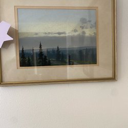 En vacker oljemålning signerad Otto Andersson 1943. Motivet är ett kustlandskap med fiskebodar och en man som arbetar med fisknät.
